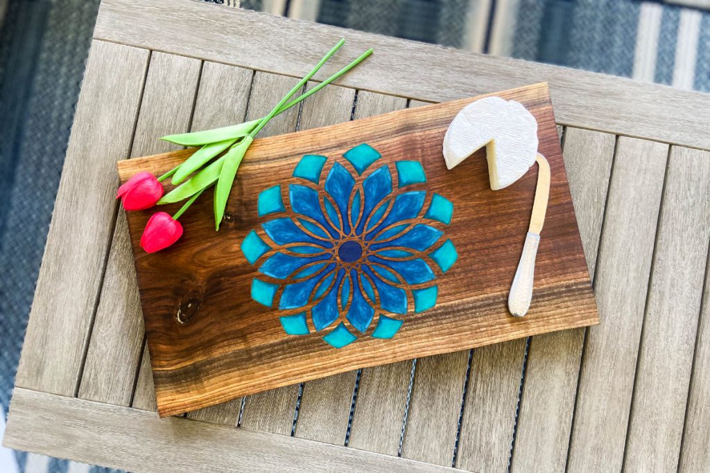 The board is made from sustainably sourced solid, kiln-dried walnut. We cut our designs into the walnut and fill them with resin, then sand it to a smooth, velvety surface. The resin inlay process gives you a strong, durable board that will last a life-time and can be refinished many times.