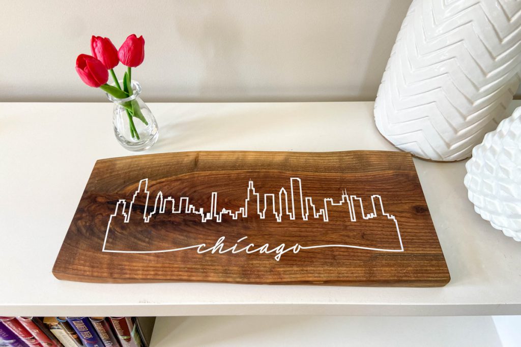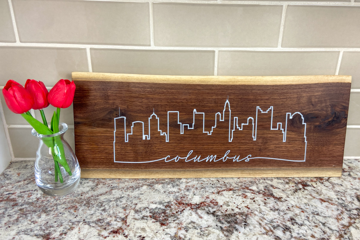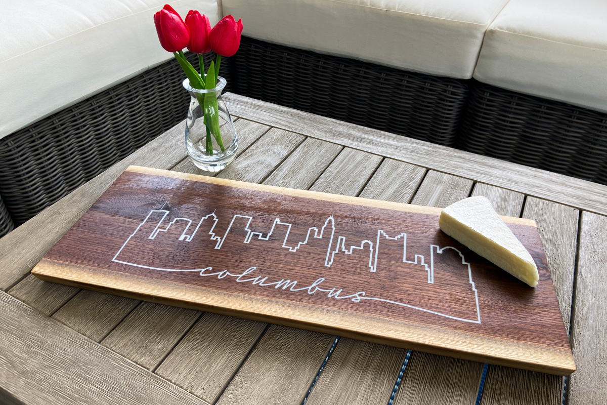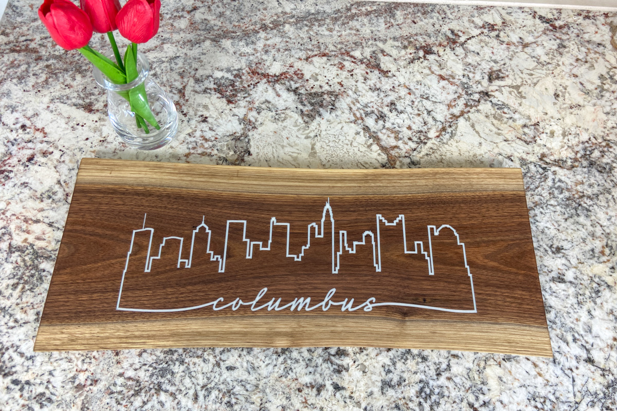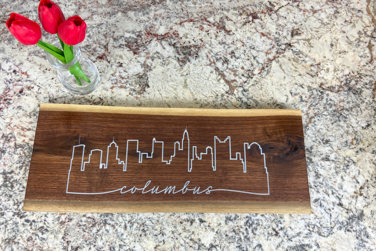 Do you love Columbus? This gorgeous charcuterie board is perfect for fans of Columbus! The Columbus, Ohio Skyline with Columbus in a script font are engraved and inlaid with a diamond white resin on a beautiful live edge walnut slab.